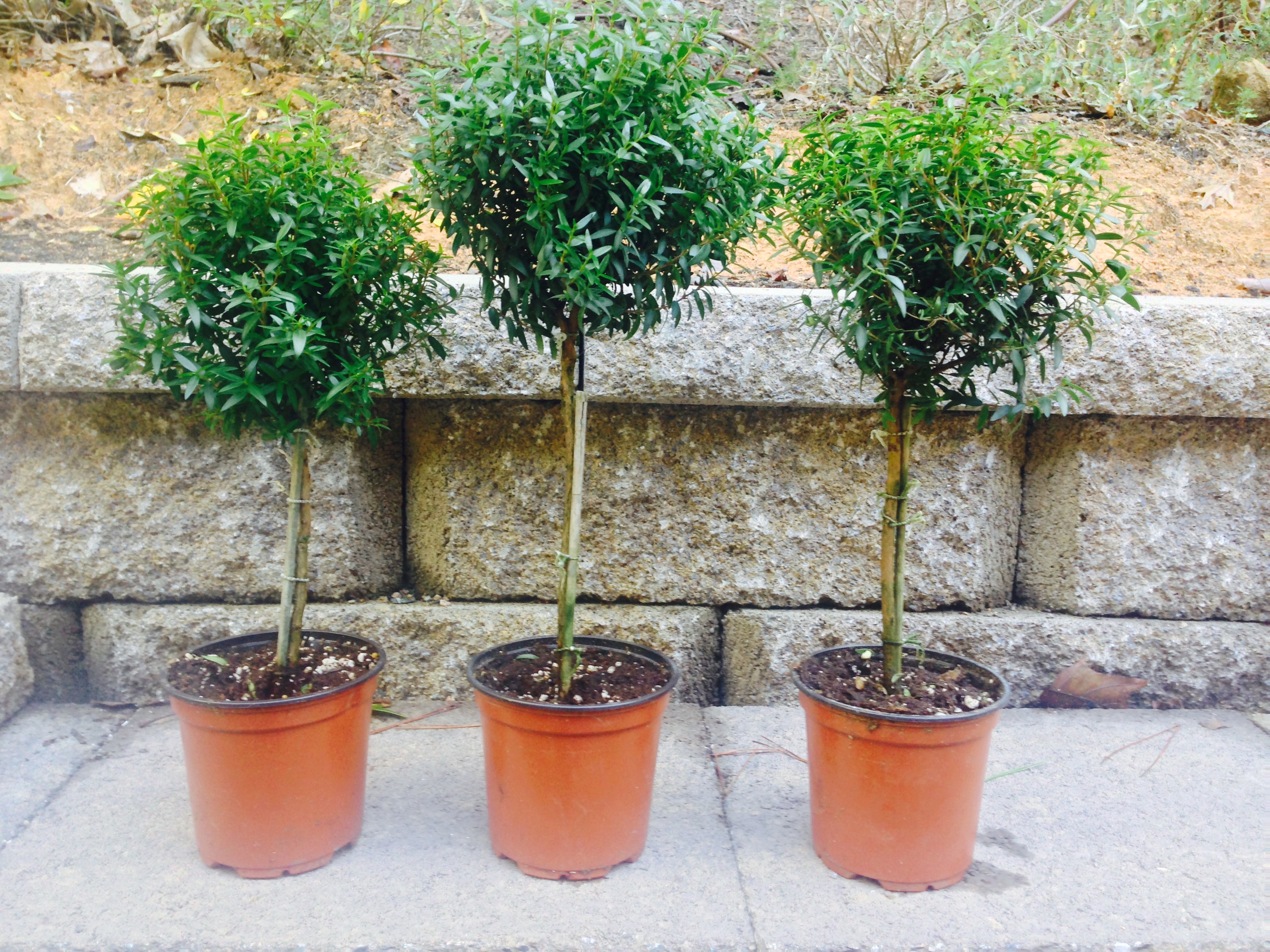 It’s amazing what a lift a few plants can give you. I found these miniature Myrtle Topiaries in Raleigh. It hasn’t been easy to locate these gems. Now, every morning, these 3 little “green balloons” on a stem will cause me to smile! I can also give them personalities with a ribbon or stakes. Here’s some ideas for your special spot!